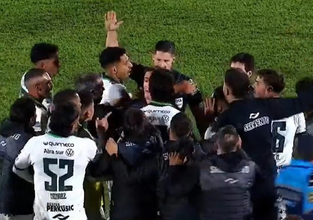 Ramírez, un bochorno de árbitro, tuvo que irse de la cancha escudado por la policía ante lo patético de su trabajo en el partido.