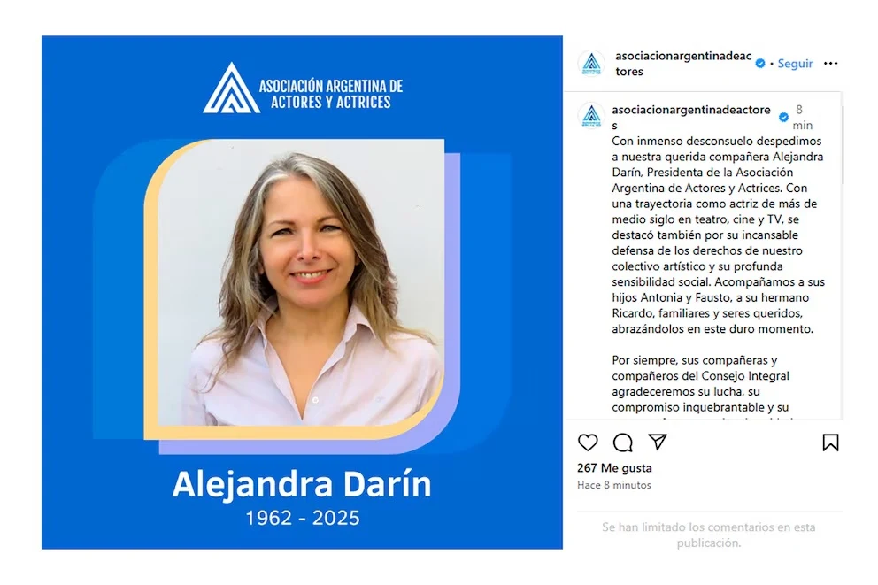 El mundo del espectáculo se conmocionó las últimas horas al conocerse la muerte de Alejandra Darín. La noticia fue dada conocer por la Asociación Argentina de Actores y Actrices, donde era afiliada desde el año 1973 y desempeñaba como presidenta desde el 2011.
